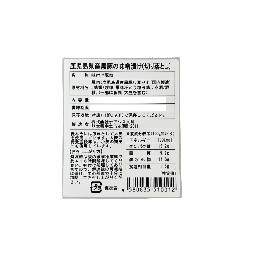 ご覧頂きありがとうございます。 日本有数の黒豚産地である鹿児島県から、 豚肉の中でも高級豚として知られる黒豚の味噌漬け(切り落とし)をお届けします。 【鹿児島県産黒豚】 やわらかくて歯切れがよくジューシーです。 脂はさっぱりとしていて臭みがありません。 味噌漬けにすることで、肉の繊維がよりやわらかく風味豊かになります。 【味噌へのこだわり】 1982(昭和57)年の限定販売以来。39年間愛されてきた 「まぼろしの味噌 米麦あわせ」は全て国産の原料にこだわり、 香料や保存料などの添加物を一切使用せず製造しています。 米味噌のあっさりとした味わいと、麦味噌独特のコクを絶妙にブレンドした味噌。 麦の旨みと米の甘みがマイルドに調和した香り高い逸品です。 「現代の名工」・「フードマイスター」・「黄綬褒章」等、 数々の名誉ある賞を受賞した永田富浩が丹精込めて作り上げたこだわりの逸品。 原料には、厳選した国内産大豆・大麦・米・食塩を使用し、 阿蘇の伏流水で仕込んだ、無添加・中甘口の米麦あわせ味噌です。 米の甘みと麦の旨みがまろやかに調和した香り豊かなお味噌です。 【切り落としだからこそお買得!】 通常は百貨店などに並ぶ高級品ですが、 切り落としだからこそのお買得価格でご紹介! 切り落としといえど、ばんがしっかりあるので満足いただけること間違いなし。 【使い勝手のよさ】 100gずつの個包装になっているので、 扱いやすく、食べたい時に食べたい分だけお使いいただけ、 冷凍庫の隙間にも収納しやすいです。 ーーーーーーーーーーーーーーーーーーーーーーーーーーーーーーーーーーーー 商品説明 商品:鹿児島県産黒豚の味噌漬け 産地:豚(鹿児島県) 規格:100g×10袋 計1㎏ 荷姿:専用段ボールに梱包してお届け 配送温度帯:冷凍 ーーーーーーーーーーーーーーーーーーーーーーーーーーーーーーーーーーーー 注意事項 ※生ものにつきキャンセル、返品はお断りさせて頂きます。 ※配送については、土日祝日を除いて7日以内に発送させて頂きます。 ※離島、沖縄県については配送不可エリアとなります。ご了承くださいませ。 ーーーーーーーーーーーーーーーーーーーーーーーーーーーーーーーーーーーー