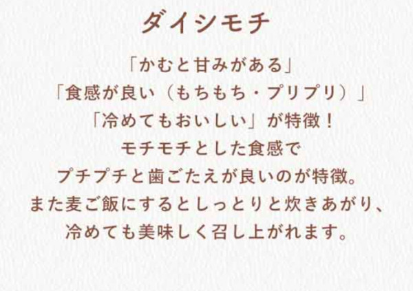 ★ダイシモチ(もち麦)は「かむと甘みがある」「食感が良い(もちもち・プリプリ)」「冷めてもおいしい」が特徴!