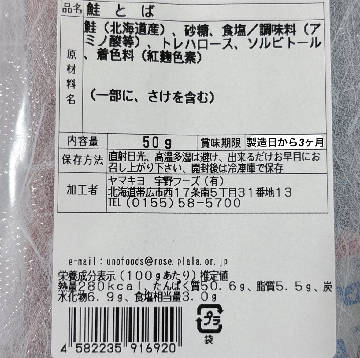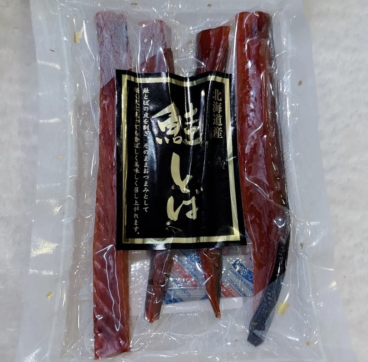 北海道産 鮭とば50g 『鮭とば』とは、鮭を半身におろして軽く塩味をつけ、短冊状に縦に細くカットし、冷たい風で干して乾燥させた商品です!