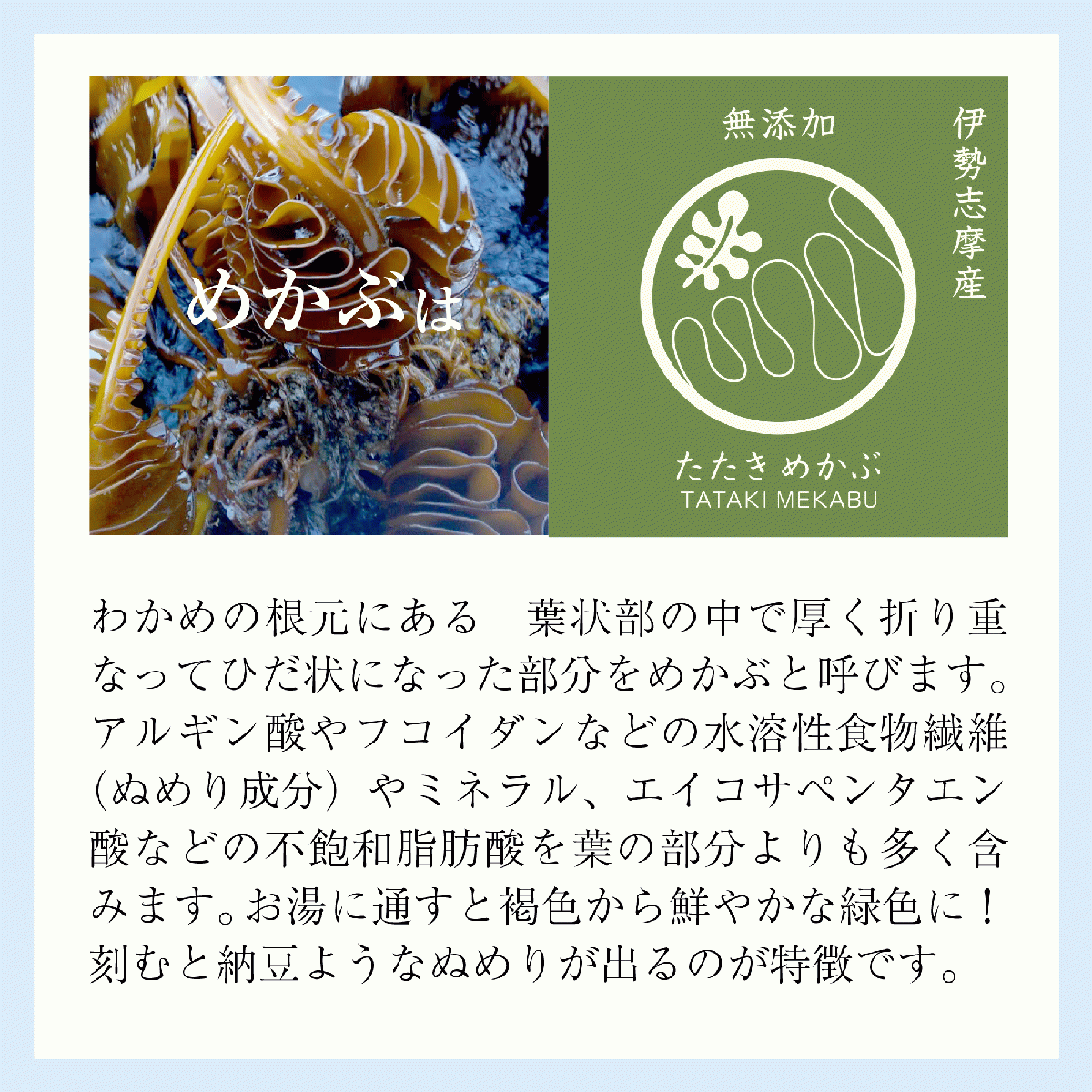 旬の時期に五十鈴川からの山の栄養と黒潮が混ざり合う栄養満点の伊勢湾で育った肉厚のめかぶは粘りも食感も抜群。海藻本来の風味も芳醇です。めんつゆやポン酢で味付けしてあったかいご飯にかけたりうどんやそばにかけて食べてもおいしくいただけます。また納豆とも相性がよくお味噌汁に入れていただいてもおいしく召し上がれます。