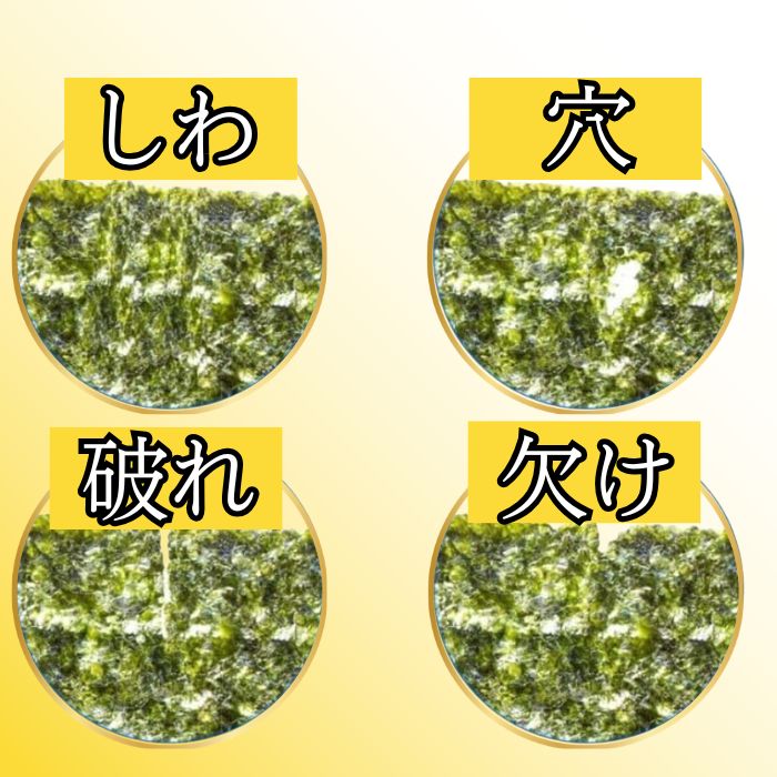 ※焼き海苔の色は黒ではなく緑色です。(海水温度が高い時期に収穫されたため、色褪せが生じているものがございます。