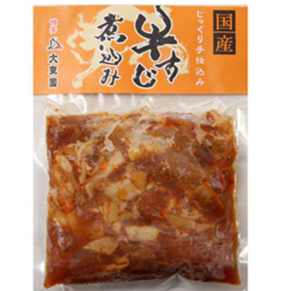 牛すじ(国産)、醤油、みりん風調味料、砂糖、にんにく、唐辛子、黒胡椒 /調味料(アミノ酸等)、(一部に牛肉・小麦・大豆を含む)
