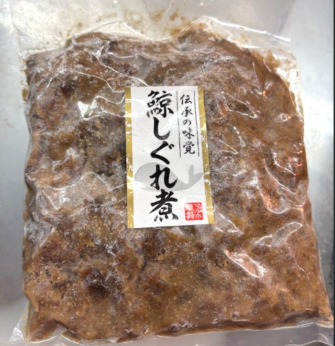 原材料:ニタリクジラ、生姜、砂糖、みりん、水飴、醤油、にんにく、食塩、鰹エキス/ph調整剤、加工澱粉、カラメル色素、(一部に小麦、大豆を含む)