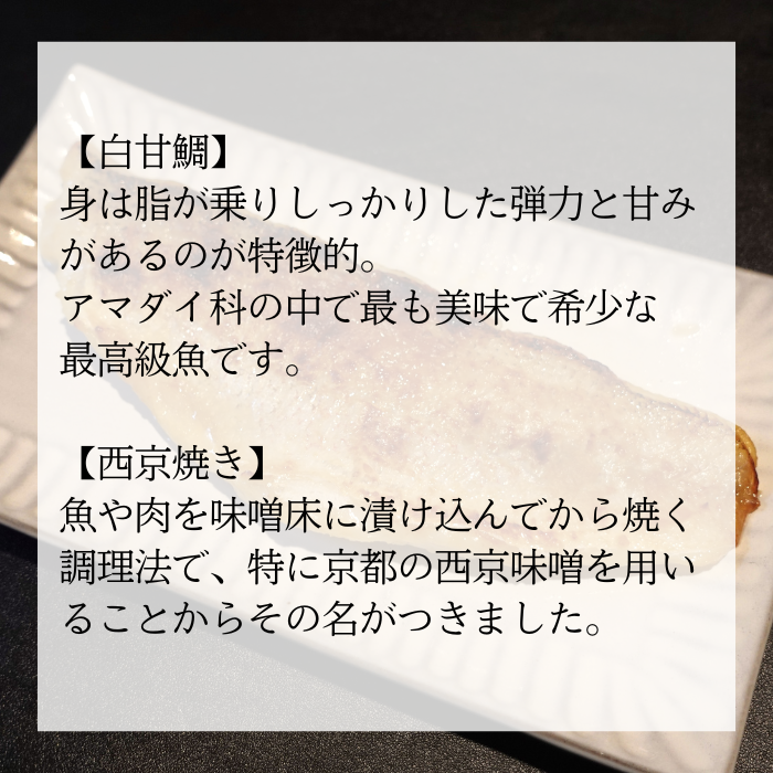 ★幻の最高級魚「白甘鯛」を西京漬けにしております。高級料亭の味です。
